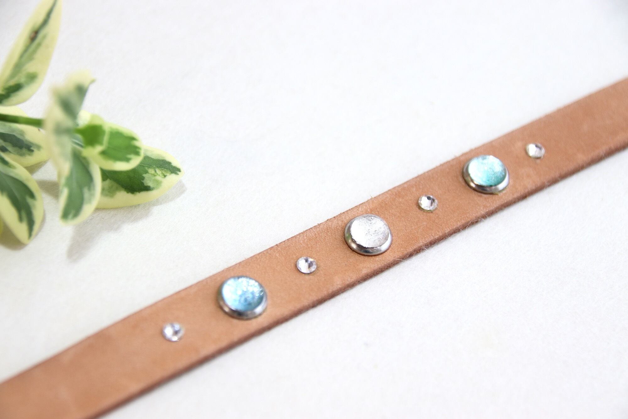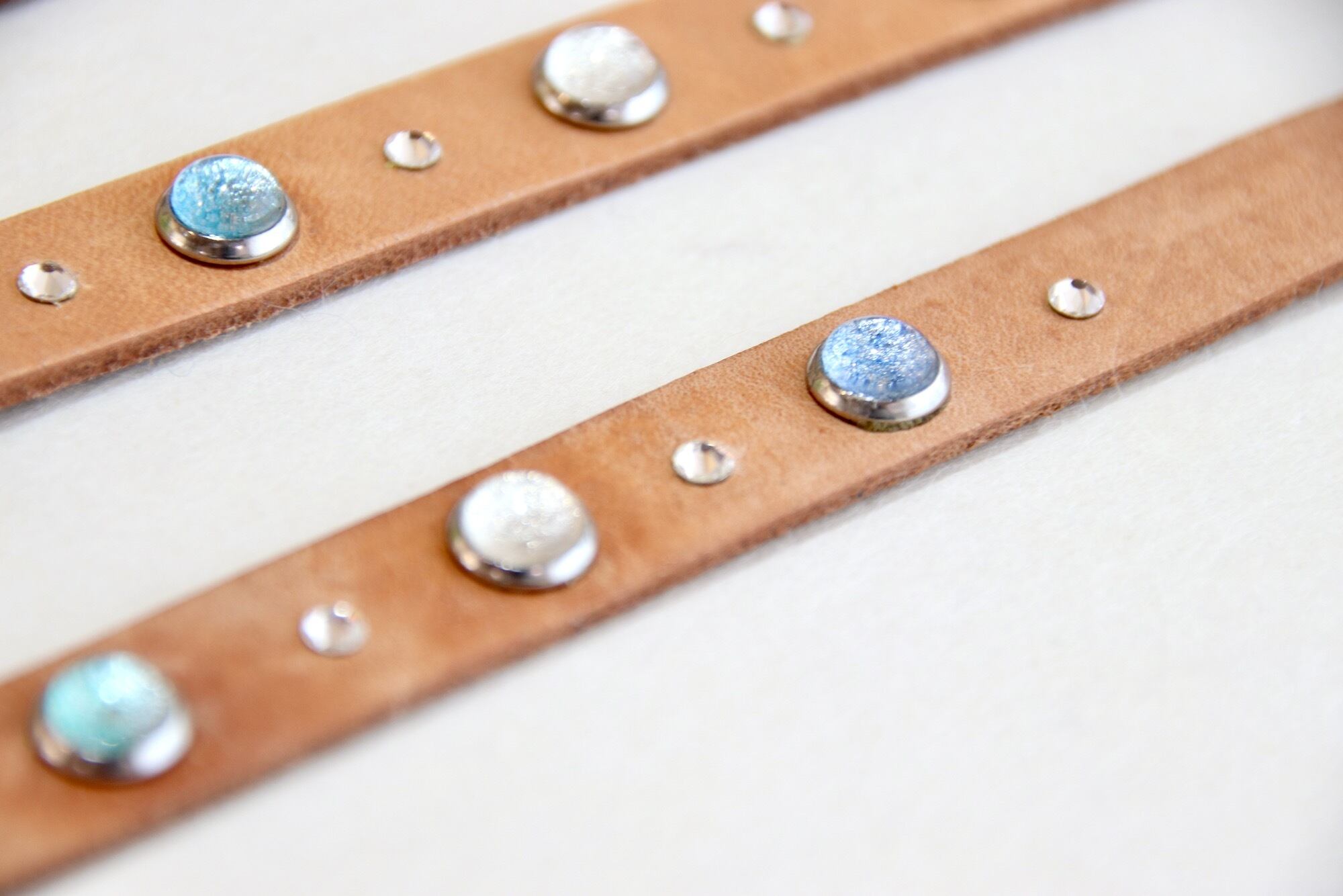 和紙とガラスで制作したチャームと、スワロフスキーをあしらった本革ブレスレット。