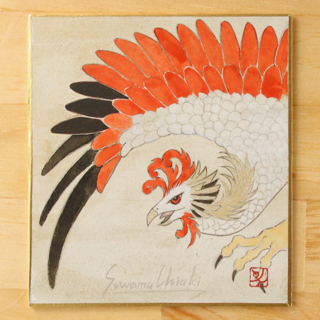 This is an illustration of Suzaku created using ink and pigments in the Japanese painting style known as "Shikishi-art." You have the option to choose either in-store pickup or delivery for this mini artwork. International shipping is also available.