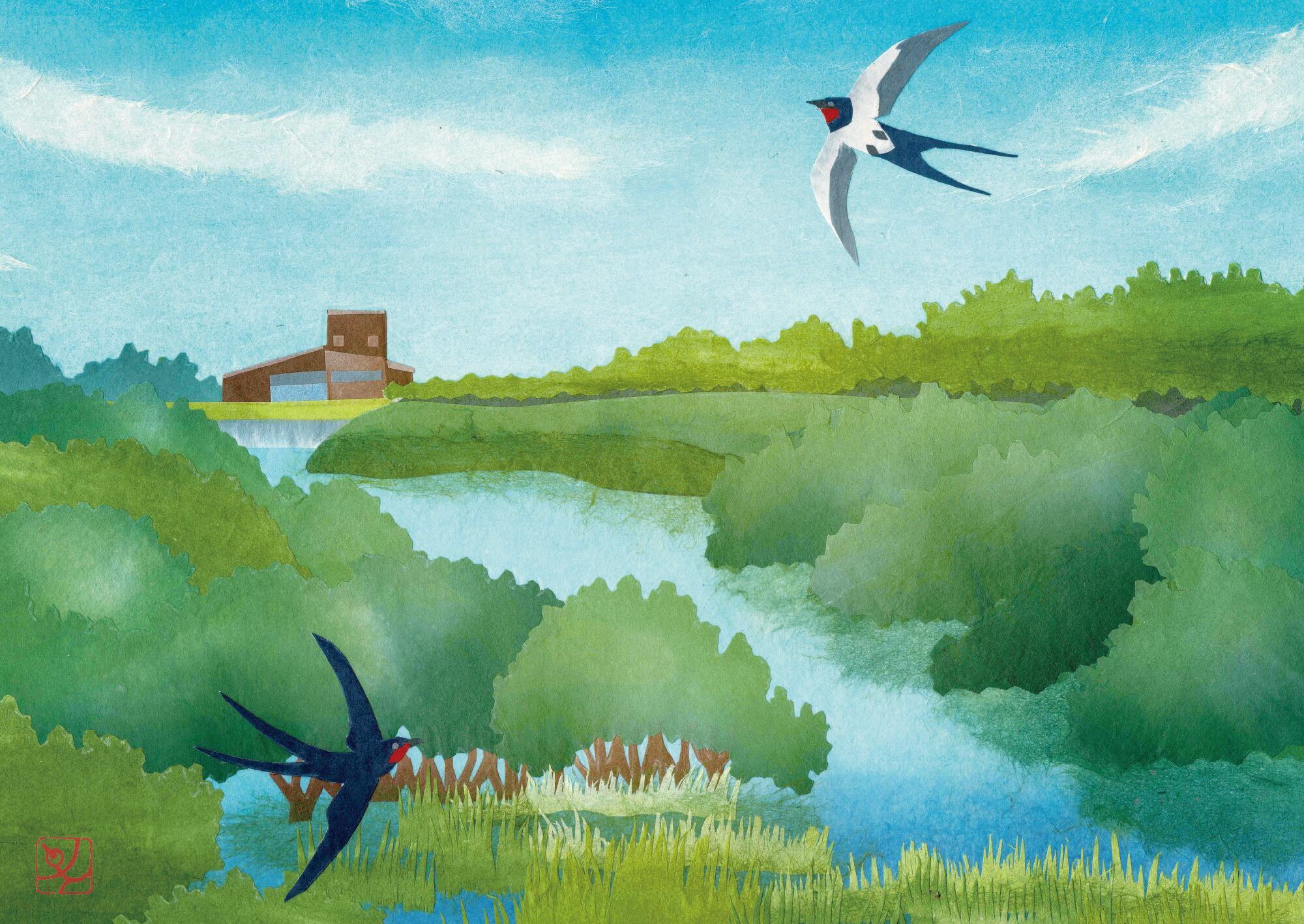 清々しい空と水辺の空気感、風のように自由に飛ぶツバメの姿を和紙貼り絵で表現しました。